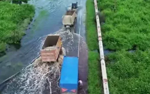 Genangan air tidak hanya menutup badan jalan nasional, tetapi juga meluas hingga ke halaman dan permukiman warga. Kondisi ini mengganggu aktivitas masyarakat sekaligus arus lalu lintas di jalur utama tersebut.