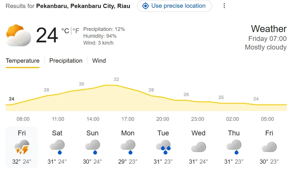 Berdasarkan informasi prakiraan cuaca yang di rilis BMKG Kota Pekanbaru, sebagian besar daerah di Riau masih berpeluang menikmati cuaca relatif stabil pada pagi dan siang hari. Aktivitas masyarakat diperkirakan dapat berjalan normal, meski suhu udara cukup terasa panas dengan kelembapan yang tinggi.