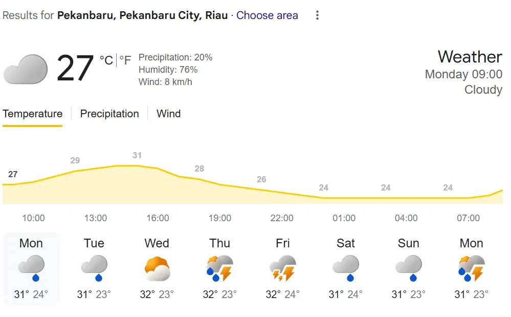 Memasuki siang hingga sore hari, kondisi cuaca relatif cerah berawan. Meski demikian, hujan ringan masih berpotensi turun di Kampar, Rokan Hulu, dan Kuantan Singingi, sehingga aktivitas masyarakat diimbau tetap waspada.