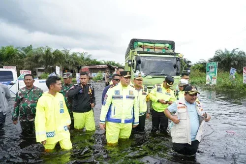 Kapolda Riau Irjen Pol Muhammad Iqbal yang didampingi Dirlantas Polda Riau,Kapolres Pelalawan AKBP Suwinto dan Bupati Pelalawan H. Zukri, wakil Bupati Pelalawan H. Nazaruddin, Ketua DPRD Kabupaten Pelalawan Baharuddin dan sejumlah Forkopimda Pelalawan, yang turut hadir saat Kapolda turun mengecek kondisi banjir dan arus lalu lintas di jalan Lintas Timur yang terendam banjir.