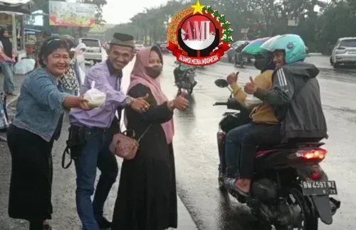 Tidak hanya itu saja, terlihat juga pria berbaju kemeja lengan panjang berwarna ungu asik dan tersenyum bersama lainnya membagikan 150 kota snack ,dan 250 cup mangkok plastik berisikan kacang Hijau kepada masyarakat kota Pekanbaru Provinsi Riau, yang melintasi MTQ Jl Jendral Sudirman kota Pekanbaru, menggunakan kendaraan roda 2 dan Empat serta Penumpang Basway.